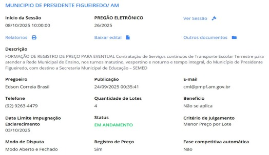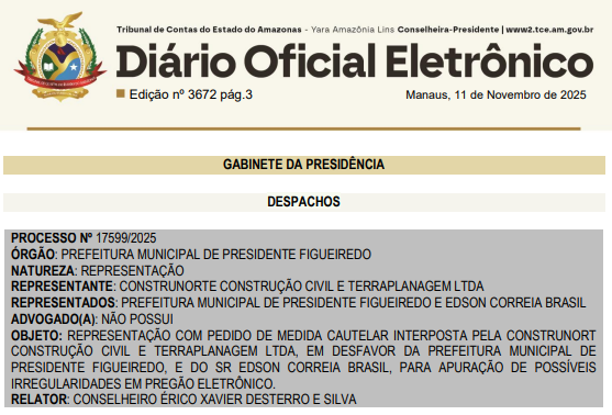 A empresa também pediu que o Tribunal julgue procedente a representação e determine à Prefeitura de Presidente Figueiredo a anulação integral do edital, com republicação de novo certame “que elimine todos os vícios e restrições ilegais, restaurando integralmente a competitividade e a busca pela proposta mais vantajosa para a administração pública”.