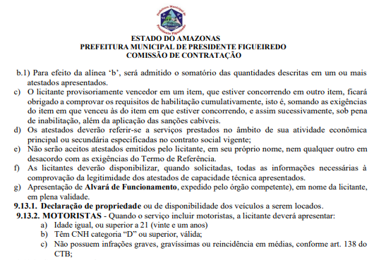 Um dos itens do edital, citado no documento, determina que as empresas participantes apresentem previamente a documentação dos motoristas — incluindo idade mínima, categoria da CNH e histórico de infrações de trânsito. A Construnorte argumenta que a exigência é “manifestamente ilegal, desproporcional e restritiva”, configurando “flagrante violação aos princípios basilares da licitação pública, notadamente os da legalidade, isonomia, competitividade, economicidade e razoabilidade”.