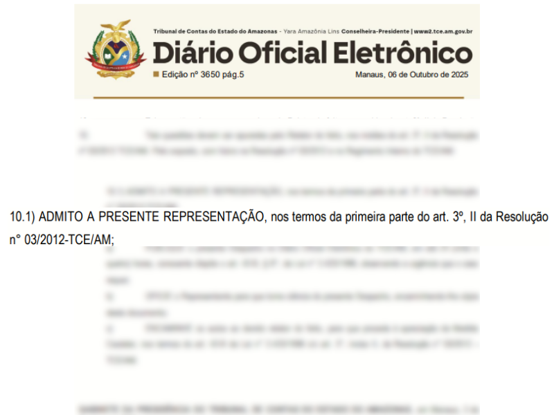 O despacho de admissibilidade, assinado pela Presidência do TCE-AM, reconheceu que há indícios suficientes para o prosseguimento das investigações e encaminhou o caso ao relator para análise do pedido de cautelar. “A Representação é um instrumento de fiscalização e exercício do controle externo utilizado justamente para se exigir da máquina pública a investigação sobre determinados fatos que aparentemente ensejam prejuízos ao erário”, diz um trecho do documento.